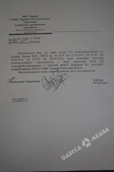 Сотрудники Управления по борьбе с организованной преступностью ГУ МВД Украины в Одесской области не нашли подтверждения фактов нарушений антикоррупционного законодательства со стороны директора одесской филии госпредприятия «Укргосстройэкспертиза» Вячеслава Шандрика. Об этом корреспонденту ИА «Одесса-медиа» сообщили в ведомстве.