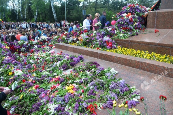 Несмотря на запрет власти, люди прибыли к мемориалу с георгиевскими ленточками, транспарантом с изображением Иосифа Сталина с подписью «Одесса - русский город. Позор Украине», а также воздушными шариками, символизирующими небезызвестный «триколор».