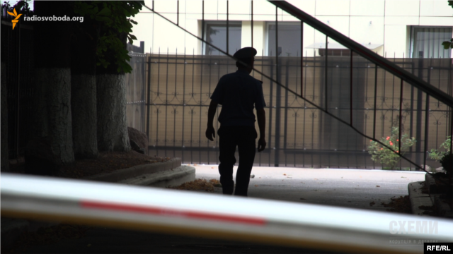 Кто выходит из дорогих авто, зафиксировать почти невозможно. Сам заезд на парковку главного здания ДФС от простых граждан перекрыто двумя шлагбаумами. И милиционером.