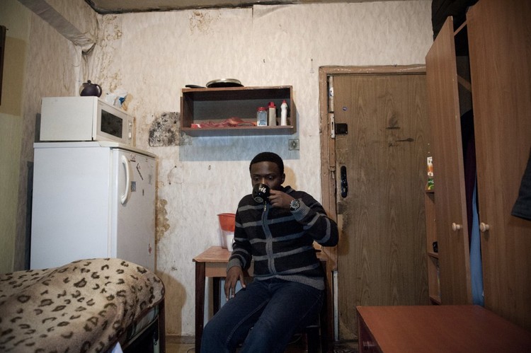 Двое нигерийских студентов, Кристофер Онойя, 22 года (сверху), и Иссак Исмайла, 24 года (снизу), приехали в Россию по гранту. Онойя говорит: «Если честно, то мне здесь совершенно не нравится, потому что в комнатах полно тараканов и клопов. Мы сделали ремонт — все поменяли, заменили обои, лампы — но, когда мы только въехали, это был кошмар».