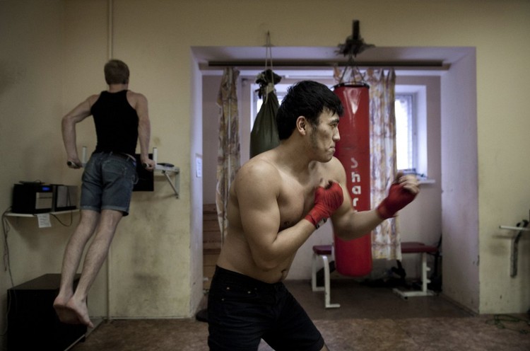 24-летний Залкар Токтогулов из Кыргызстана, который изучает живопись, тренируется в спортзале общежития.