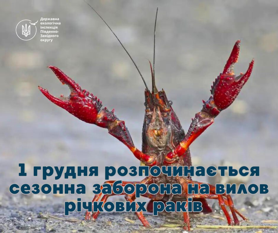 З метою охорони та відтворення популяцій річкових раків на території України з 1 грудня 2025 року по 30 червня 2026 року встановлено сезонну заборону на їх вилов, інформує Державна екологічна інспекція Південно-Західного округу.
