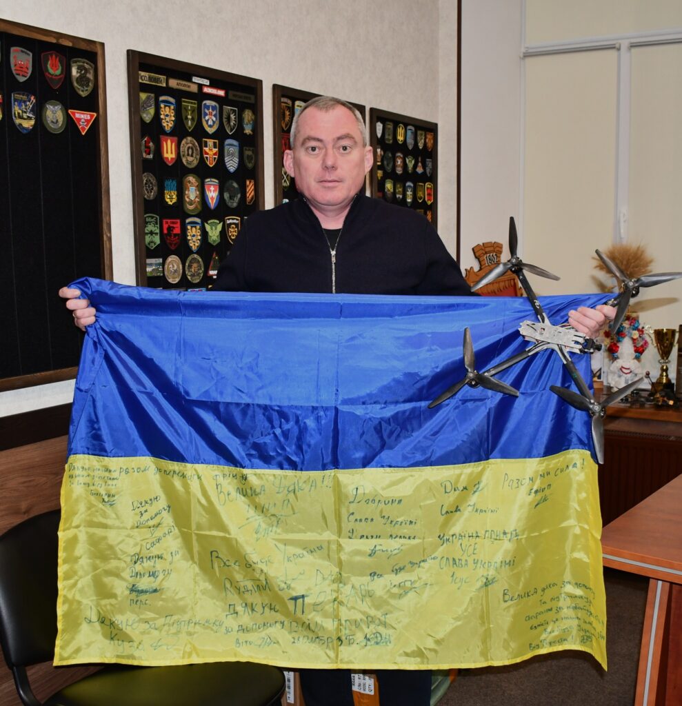 На знак подяки за постійну підтримку підрозділу захисники передали очільнику громади Державний Прапор України з власними підписами та побажаннями, а також трофей — збитий ворожий FPV-дрон.